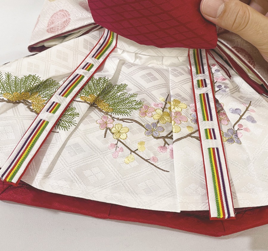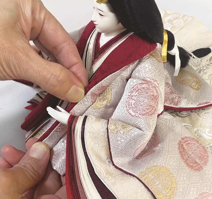 ※男雛の正面にあります飾り帯のビニールや男雛・女雛の袴を包んでいるビニールは外さないでください。