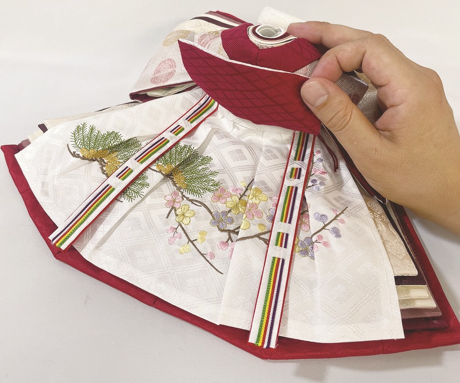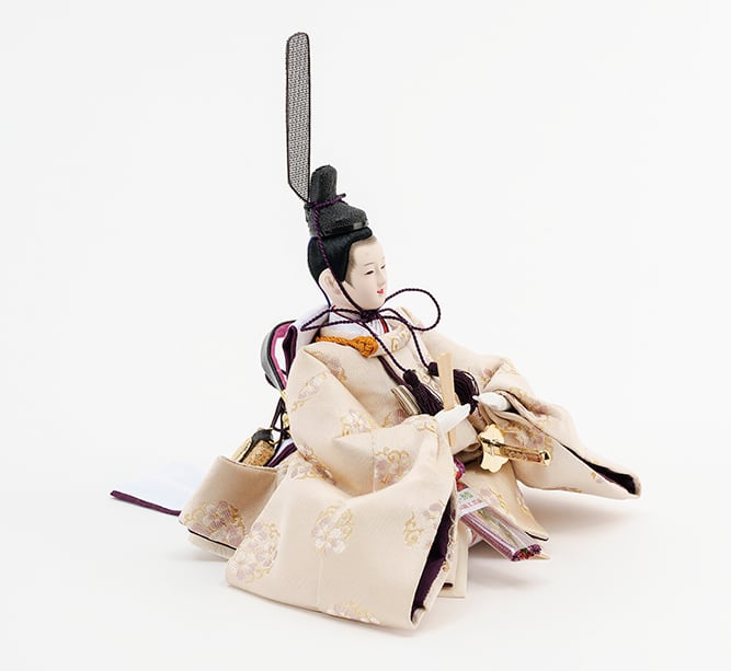 ※男雛の正面にあります飾り帯のビニールや男雛・女雛の袴を包んでいるビニールは外さないでください。