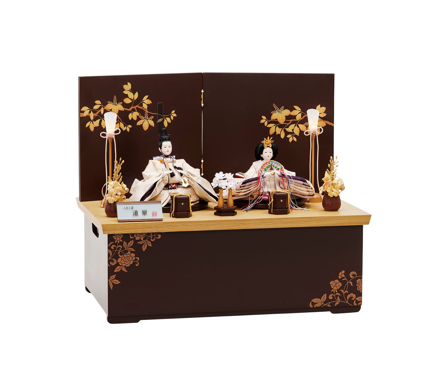 オーク色の収納箱にはお家の繁栄を願う唐草牡丹のデザインを採用。