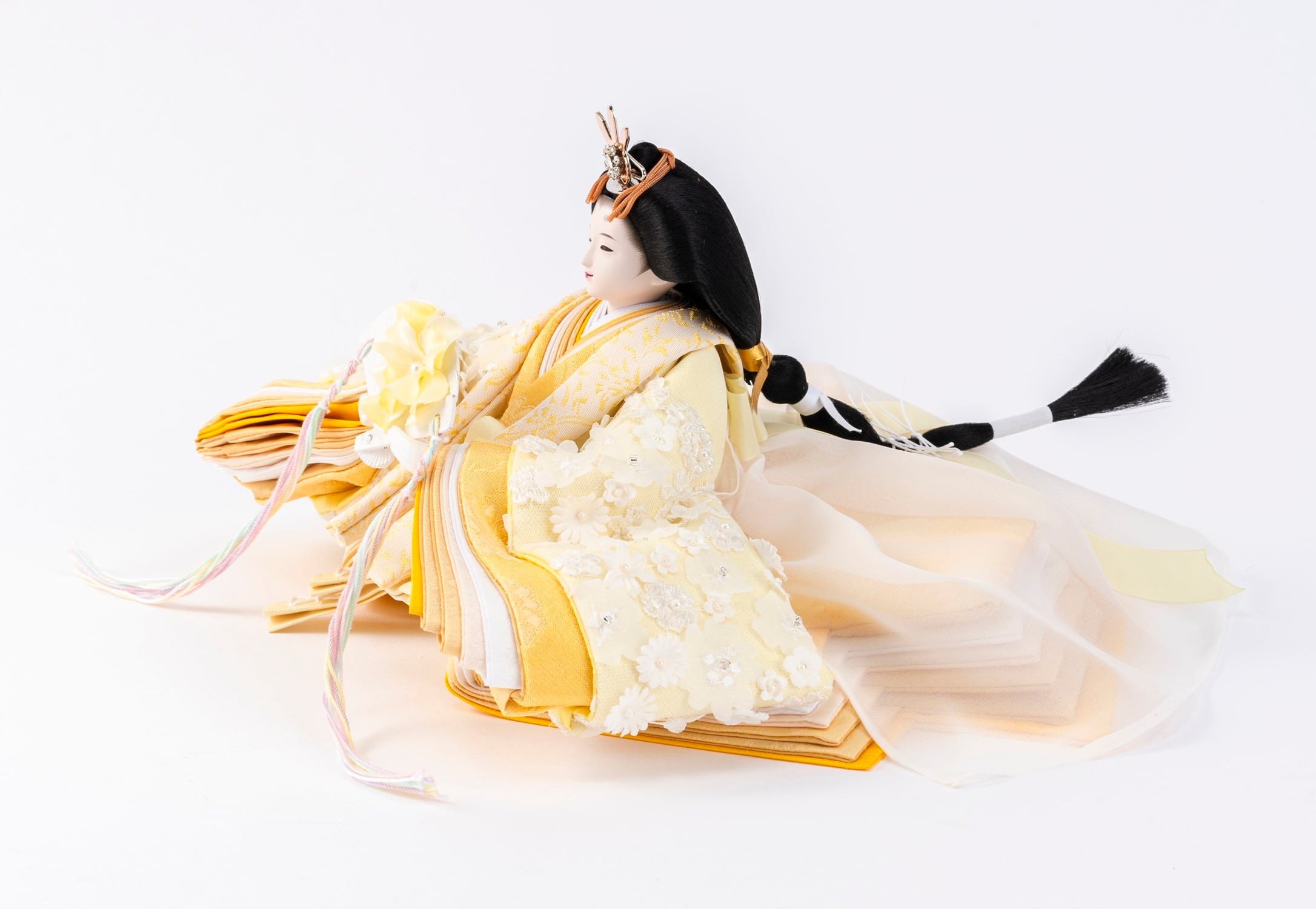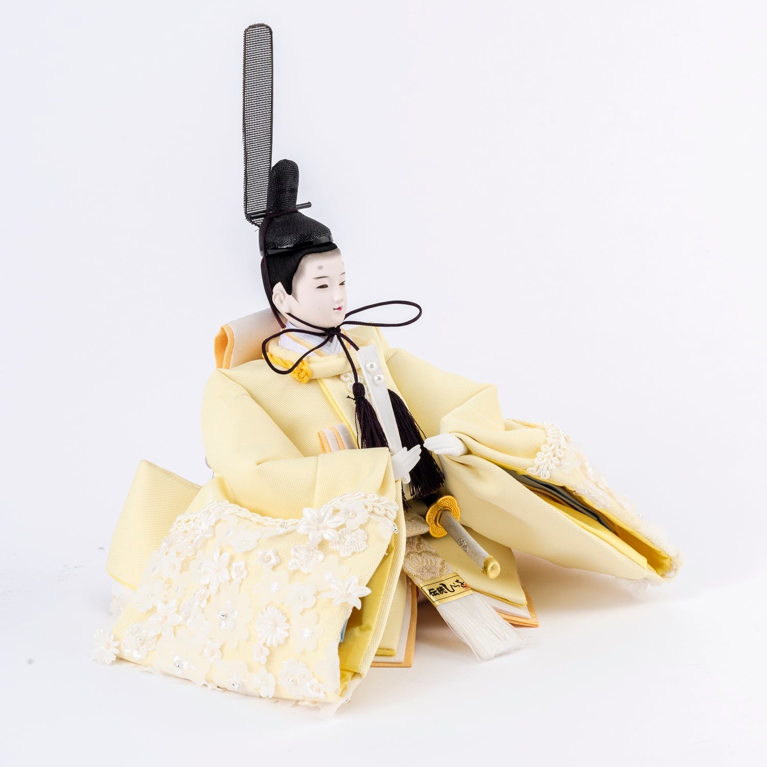 ※男雛の正面にあります飾り帯のビニールや男雛・女雛の袴を包んでいるビニールは外さないでください。